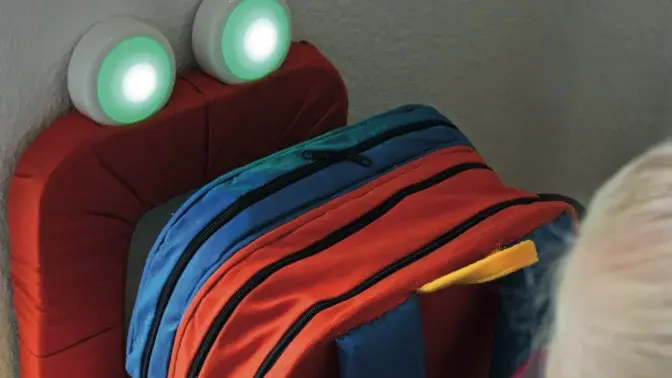 Eine interaktive Packstation kommuniziert mithilfe von Lichtern mit dem Schulkind und zeigt an, ob noch Materialien fehlen oder ob der Schulranzen vollständig und korrekt gepackt ist.